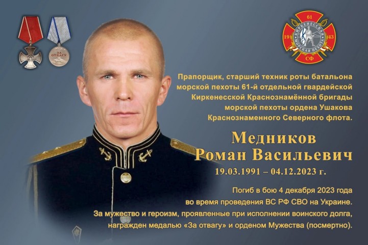 Медников Роман Васильевич – прапорщик, старший техник роты батальона морской пехоты 61-й отдельной гвардейской Киркинесской Краснознамённой бригады морской пехоты ордена Ушакова краснознамённогоСеверного флота.